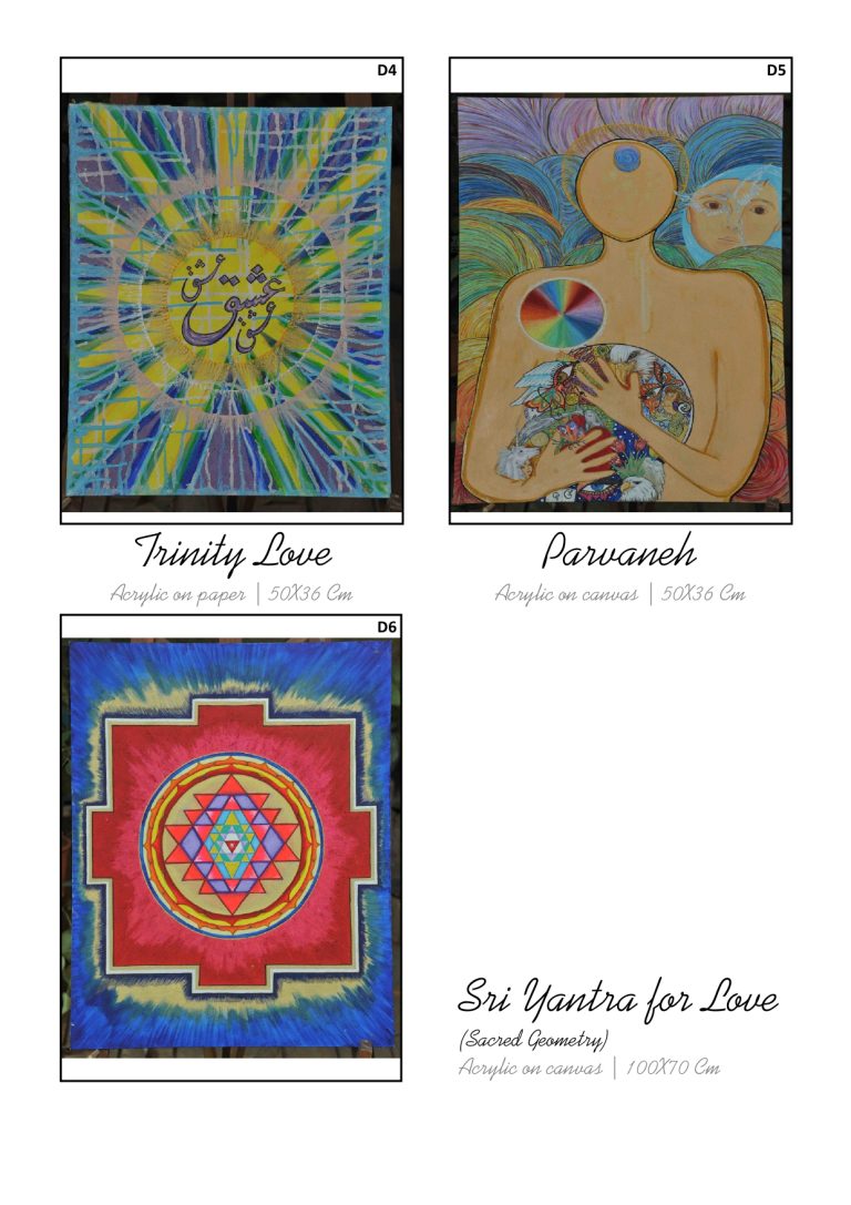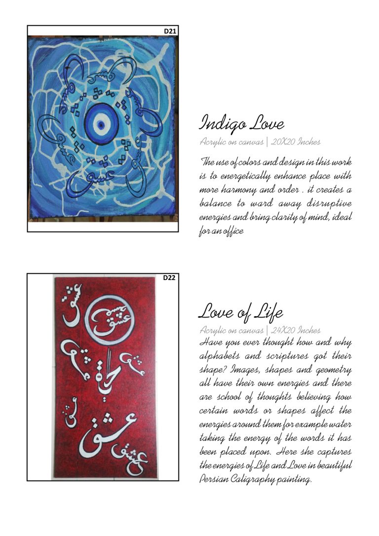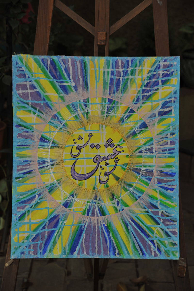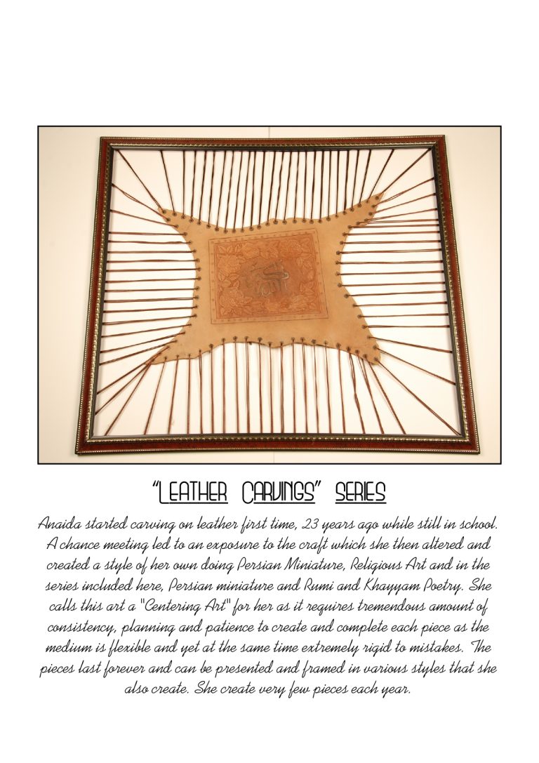 She works across oil, acrylics, watercolors, ink, pencil, chalk, and coal — shifting mediums like moods. Her repertoire also includes rare forms such as Persian miniature carvings combined with calligraphy of Rumi and Hafez, etched and painted on leather — a craft few, if any, practice today.